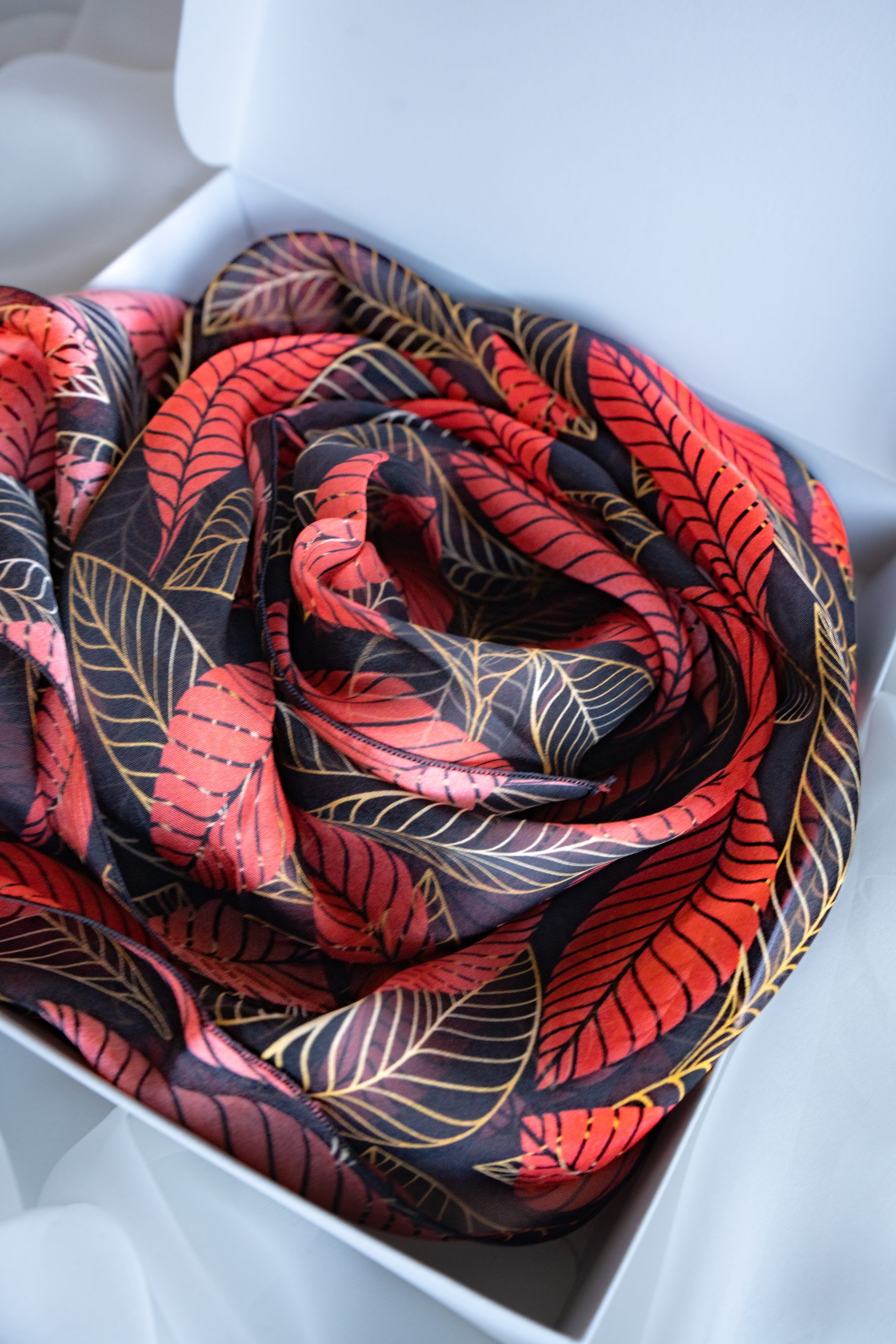 L’écharpe en soie à motif de feuillage rouge est bien plus qu’un simple accessoire ; c’est une véritable œuvre d’art qui embellit toute tenue. Tout d’abord, sa texture douce et légère caresse délicatement la peau, offrant un confort inégalé.